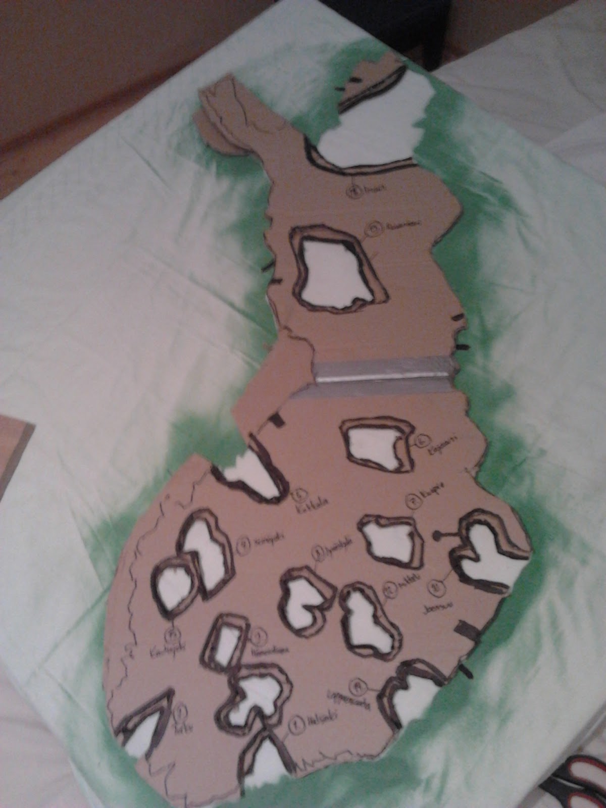 Rastien nimiä oli hauska keksiä. Pistesuunnistuksesta tuli "Hannu ja Kerttu", ruokarastilla tehtiin spagettia, joten nimeksi tuli "Kaunotar ja kulkuri". Oma rastini oli "Suomen ympäri 80 sekunnissa". Tehtävänä oli sijoittaa 15 nastaa styroksiseen Suomen karttaan. Jokainen nasta vastas kaupunkia jotka oli mainittu erillisessä kaupunkiluettelossa. EI MUUTEN OO MIKÄÄ HELPPO TEHTÄVÄ!!! Aluksi ittekki ajattelin, että pitää pistää joitaki harvinaasempia kaupunkeja listalle, mutta suurin osa ei saanu edes Turkua tai Helsinkiä oikealle paikalle. Tarkistamisessa käytin apuna tuollaisia pahvisia häkkyröitä jotka väsäsin viime tingas päivää ennen kisoja. Vanhemmilla sarjoilla oli rajoina kaupunkien rajoista ton kartan mukaan n. sentti yli. Pienemmillä kaksi. Ja siltikää ei osuttu! Tämä oli siis hyvä tehtävä. Kisoissa oli hauskaa. Mä yritin olla mahdollisimman positiivinen kaikille joukkueille. Oon huomannu että tylyt rastimiehet on HYVIN ärsyttäviä! Piirileiri Havulla olleet tunnisti mut stuertiksi!